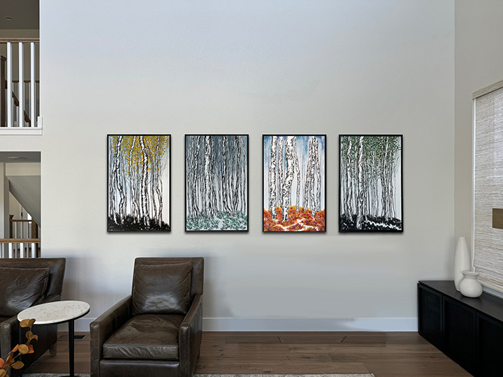 I utilize contemporary eastern brushwork that lends movement to floral, trees & landscapes. The materials consist of handmade paper, ink made of pine soot & watercolors. The paper has silk, cotton, wood chips & mulberry pressed into the pulp. The result is a velvety, tactile surface. The ancient process of preparing the artwork is similar to that of mounting eastern scrolls. This method of preparing works on paper dates back two thousand years and can only be done by a handful of artisans in America.