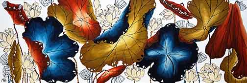 I utilize contemporary eastern brushwork that lends movement to floral, trees & landscapes. The materials consist of handmade paper, ink made of pine soot & watercolors. The paper has silk, cotton, wood chips & mulberry pressed into the pulp. The result is a velvety, tactile surface. The ancient process of preparing the artwork is similar to that of mounting eastern scrolls. This method of preparing works on paper dates back two thousand years and can only be done by a handful of artisans in America.