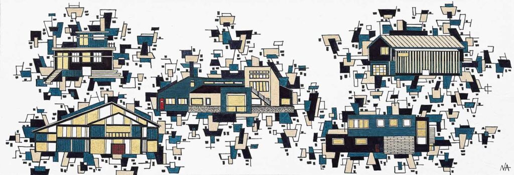 In the Modern Structures series, modern aesthetics and midcentury architecture is the guide. With a background in drafting, I design unique mini structures. There is an outward movement of the subject matter that allows the artwork to feel as if it were extending beyond the edges of the canvas. The play of lines and shapes also draws the eyes to the quiet spaces in between the lines. The artwork is done with handmade paper, ink made of pine soot and watercolors. The handmade paper has silk, cotton, wood chips and mulberry pressed into the pulp. The ancient process of preparing the artwork for framing is similar to mounting scrolls. Wheat paste is applied to the back side of the artwork and layers of paper applied until it reaches the ideal resilience. This method of preparing works on paper dates back 2 thousand years and can only be done by a handful of artisans in the US. The artwork is coated with a UV protectant varnish.