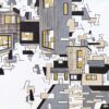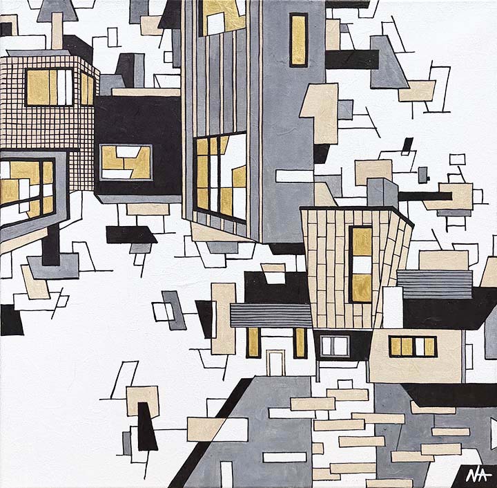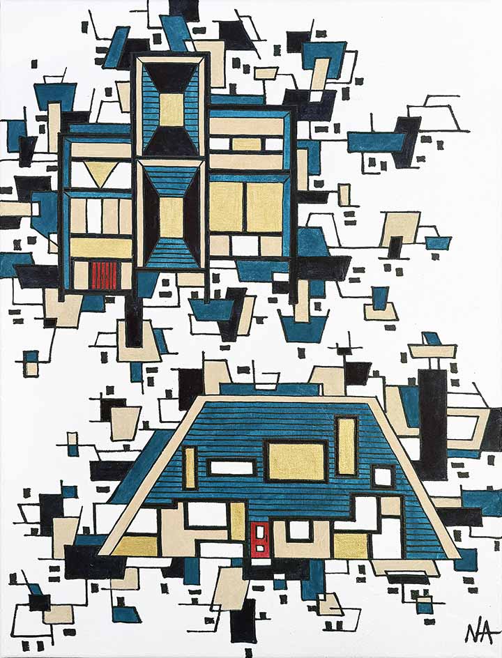 In the Modern Structures series, modern aesthetics and midcentury architecture is the guide. With a background in drafting, I design unique mini structures. There is an outward movement of the subject matter that allows the artwork to feel as if it were extending beyond the edges of the canvas. The play of lines and shapes also draws the eyes to the quiet spaces in between the lines. The artwork is done with handmade paper, ink made of pine soot and watercolors. The handmade paper has silk, cotton, wood chips and mulberry pressed into the pulp. The ancient process of preparing the artwork for framing is similar to mounting scrolls. Wheat paste is applied to the back side of the artwork and layers of paper applied until it reaches the ideal resilience. This method of preparing works on paper dates back 2 thousand years and can only be done by a handful of artisans in the US. The artwork is coated with a UV protectant varnish.