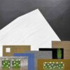 I first start by stretching handmade paper made of cotton, mulberry and straw, on large 4’x8’ boards. Medium body acrylics are then used to texture the surface, however, sometimes the paper is left in its natural color to add an organic element to the artwork.  Each shape is then cut freehand giving the piece’s crisp edges as well as organic character.  Wheatpaste that is shipped from Japan in powder form is boiled down with water and then pushed through a horse hair strainer to remove all fine lumps.  The glue is then applied with a wide brush to the back of each piece and placed on the artwork making sure that all excess glue and bubbles are removed between each application. This technique is traditionally how antique shoji screens and scrolls are made.