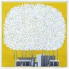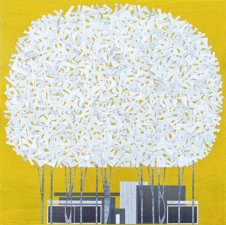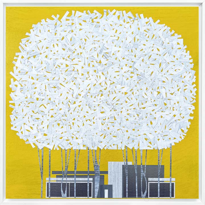 I first start by stretching handmade paper made of cotton, mulberry and straw, on large 4’x8’ boards. Medium body acrylics are then used to texture the surface, however sometimes the paper is left in its natural color to add an organic element to the artwork. Each shape is then cut freehand giving the piece’s crisp edges as well as organic character. Wheat paste that is shipped from Japan in a powder form is boiled down with water and then pushed through a horse hair strainer to remove all fine lumps. The glue is then applied with a wide brush to the back of each piece and placed on the artwork making sure that all excess glue and bubbles are removed between each application. This technique is traditionally how antique shoji screens and scrolls are made.