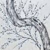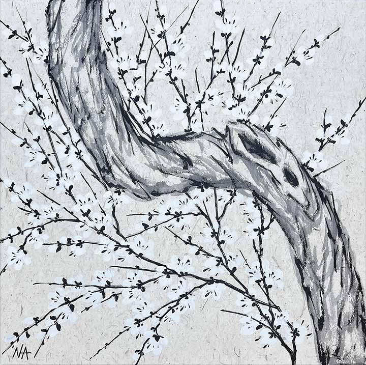 I utilize contemporary eastern brushwork that lends movement to floral, trees & landscapes. The materials consist of handmade paper, ink made of pine soot & watercolors. The paper has silk, cotton, wood chips & mulberry pressed into the pulp. The result is a velvety, tactile surface. The ancient process of preparing the artwork is similar to that of mounting eastern scrolls. This method of preparing works on paper dates back two thousand years and can only be done by a handful of artisans in America.